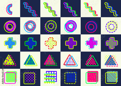 Vector set shapes in the Memphis Milano aesthetic. Contemporary layered geometric elements in vibrant colors, squiggles, diamonds, stars, triangles, circles