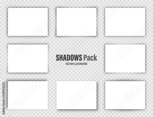 Vector shadows set. Page dividers on transparent background. Realistic isolated shadow and white blank paper in A4 format. Vector illustration.