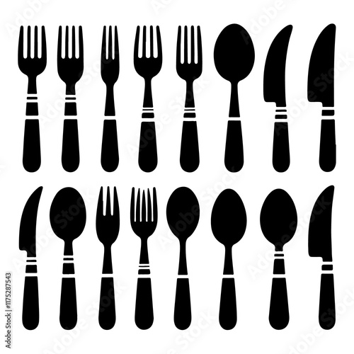 Vector silhouette Cartoon black Color Set of Cutlery with Wooden Handles Knife Fork Spoon Teaspoon