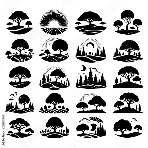 vector silhouette of different pieces of land with trees on a white background. Symbol of nature and planet