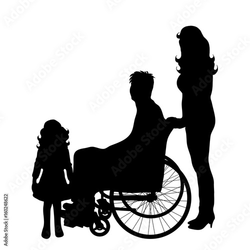 Vector silhouette of family with man on wheelchair on white background.