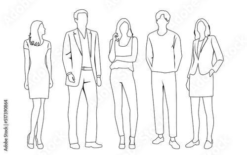 Vector silhouettes of men and a women, a group of standing business people, linear sketch, black and white color isolated on white background