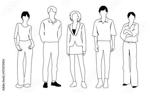 Vector silhouettes of men and a women, a group of standing business people, linear sketch, black and white color isolated on white background