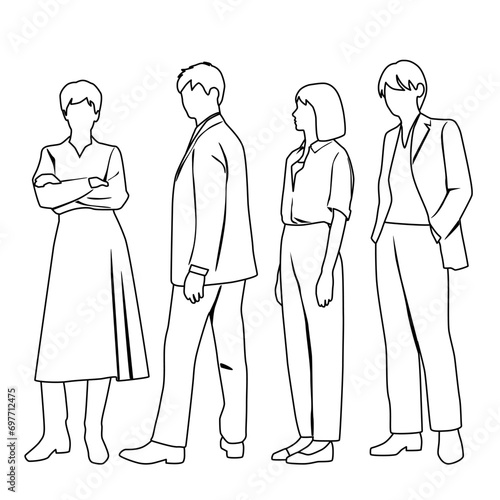 Vector silhouettes of men and a women, a group of standing business people, profile, linear sketch, black and white color isolated on white background
