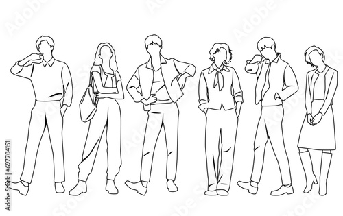 Vector silhouettes of men and women, a group of standing business people, linear sketch, black and white color isolated on white background