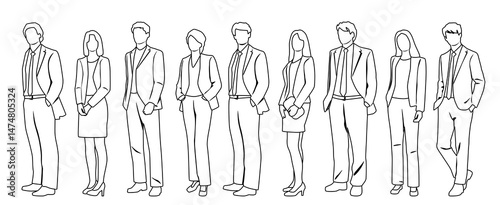 Vector silhouettes of men and women, group of standing business people, profile, hand draw, linear sketch, black and white color, isolated on white background