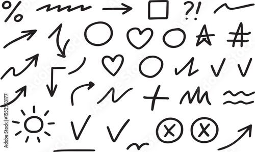 Vector swoosh doodles, hand drawn, arrows, speech bubble, heart, check mark, cross mark, square, circle, exclamation mark, star, curly, bracket, hashtag, geometric shapes, sketch. Black eps file.