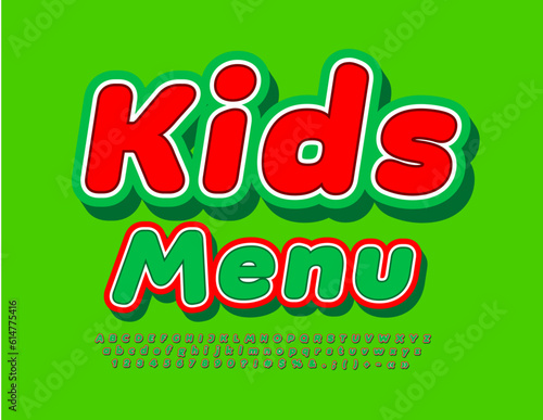 Vector template Kids Menu for Cafe and Restaurant. Bright sticker Font. Red and Green Alphabet Letters, Numbers and Symbols set