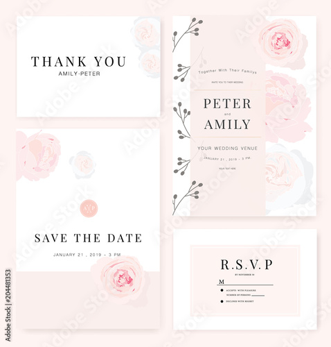 Vector template set. Wedding invitation, rsvp, thank you, save the date card design with elegant rose pink garden.