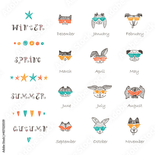 Vector template. Times of year. Four seasons and months, the template for creating a calendar with Doodle Cute Stylish Trendy Hipster Cats, Rabbits and Dogs with Sunglasses