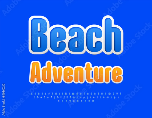 Vector travel flyer Beach Adventure. Modern Stylish Font. Blue sticker Alphabet Letters and Numbers set.