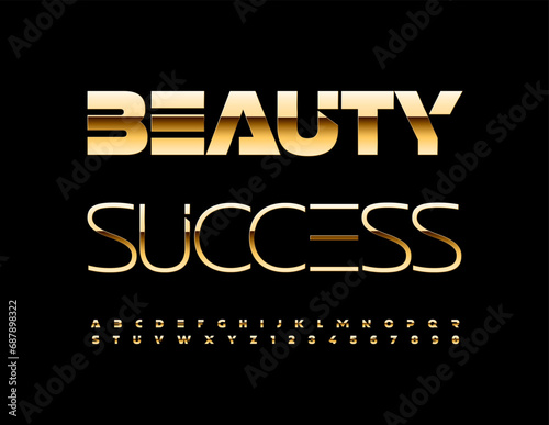 Vector Trendy Emblem Beauty Success. Futuristic Gold Alphabet Letters and Numbers set. Unique glossy Font