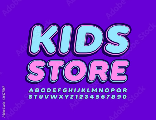 Vector trendy lodo Kids Store. Blue and Violet modern Font. Bright Youth Alphabet Letters and Numbers