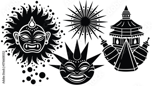 Vector tribal art with a lion and skull emblem, an ornate black and white design with heraldic symbols and decorative elements