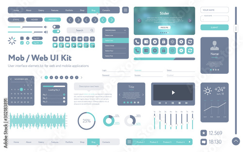 Vector UI UX kit for mobile applications and web sites. Mega set. Universal user interface template with responsive design, tools and buttons. Flat menu icons and control elements on white background.