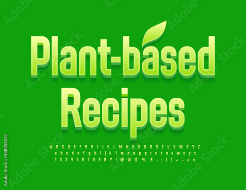 Vector vegan sign Plant-based Recipes with decorative Leaf. 3D modern Font. Green Alphabet Letters, Numbers and Symbols set
