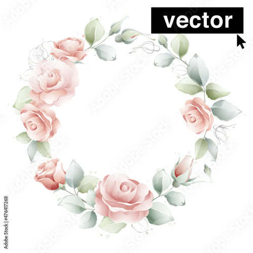 Vector watercolor flowers wreath illustration. Hand-drawn arrangements with pink roses, branches, and leaves.