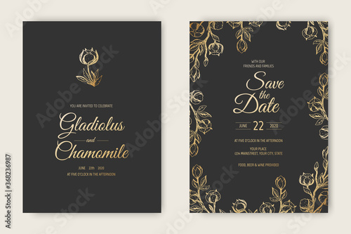 Vector wedding invitations set with cotton flowers. Romantic tender floral design for wedding invitation, save the date and thank you cards.
