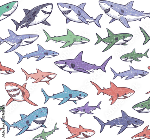 Vector white colourful cute shark pen sketch horizontal border pattern. Perfect for wall mural, posters or greeting cards.