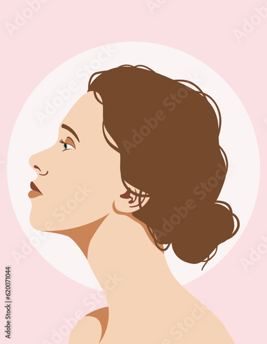 Vector woman portrait, female face profile illustration, hair in a bun, natural beauty, pastel