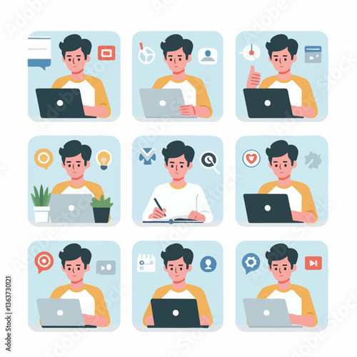 vector young man playing laptop