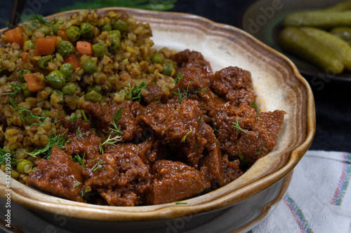 Vegan buckwheat and vegetables with seitan on plate, dark table, copy space