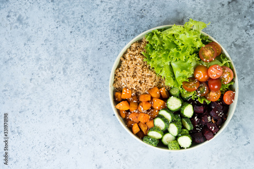 Vegan dish, quinoa salad with baked and fresh vegetables.