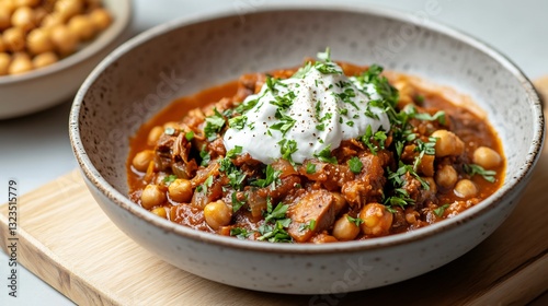 Vegan gourmet goulash with slow-cooked jackfruit, coconut cream drizzle, and roasted chickpeas, elegantly plated on a minimalist stoneware dish