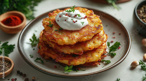 Vegan potato fritters served with sour cream on an elegant plate surrounded by spices for a delicious recipe book