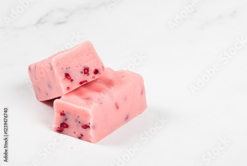 Vegan Raspberry nougat with pieces of freeze-dried raspberries. Close-up
