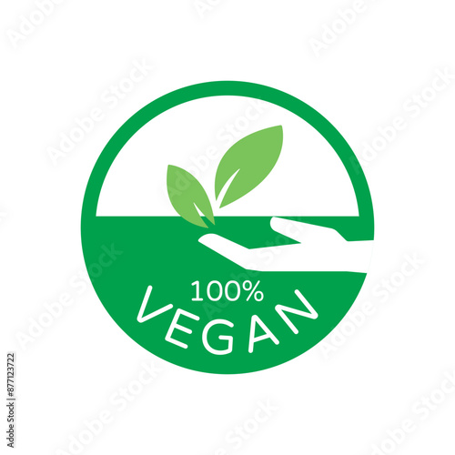 Vegan Round Green Vector Sign with Leaves in Hand on White Background. Organic, Bio and Ecological Label. Meat free, Eco, Lactose free, Healthy, Fresh and Non Violent Food.
