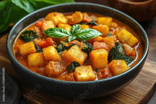 Vegan Vegetable Curry With Diced Squash And Spinach Served In A Rustic Bowl On A Wooden Surface, A Colorful And Healthy Meal Perfect For Comfort Foods In Any Season.