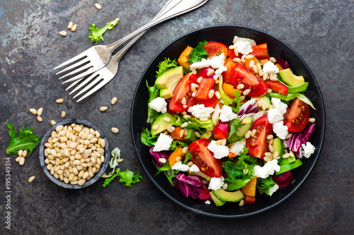 Vegetable dish, salad with avocado, pepper, tomato, italian mix, fresh lettuce, feta cheese and pine nuts. Healthy food. Top view