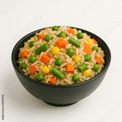 Vegetable Rice in Black Bowl on White Background – Healthy Restaurant Side Dish Presentation