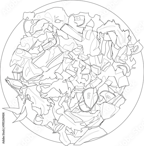 Vegetable summer salad vector in a round plate with tomatoes, cucumbers, beets, leaves, cucumbers, onions and herbs, healthy vegetarian food, black and white image, lines, coloring book