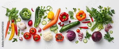 Vegetables and fruits elegantly arranged on white background creating vibrant tapestry of healthy organic produce assortment showcases variety and richness of vegetarian and vegan diets