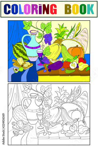 Vegetables and fruits harvest style raster illustration. Thanksgiving Day still life. Old engraving imitation.