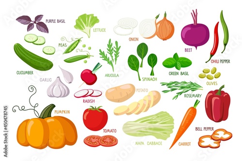 Vegetables and vegetable greens. Vector Vegetarian healthy food. Fresh organic delicious Farm products Food sketch style for farmers market, kitchen print, organic food store, cafe or restaurant
