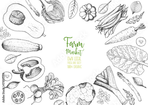Vegetables top view frame. Farmers market menu design template. Organic vegetables food poster. Vintage hand drawn sketch vector illustration. Line art graphic. Engraved style.