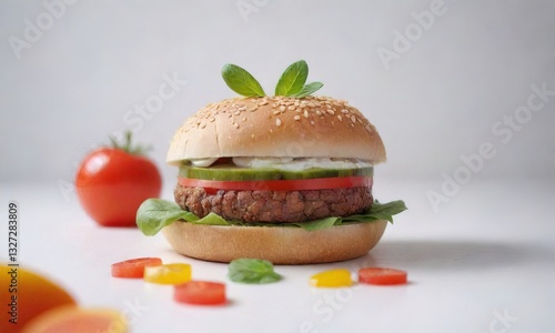 Vegetarian Lentil Burger with Sesame Bun, Tomato, Cucumber