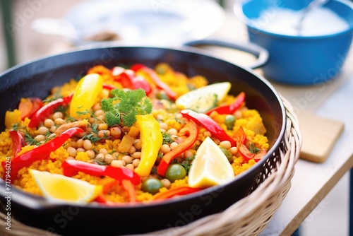 vegetarian paella with bell peppers and chickpeas, bright colors