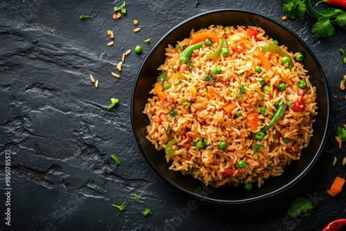 Vegetarian Szechuan Fried Rice in black bowl on slate.