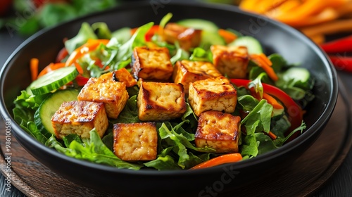 Vegetarian tofu salad often includes ingredients like mixed greens, cucumbers, carrots, and bell peppers for a colorful, crunchy base