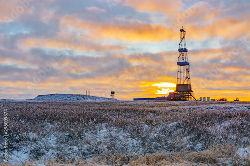 Vegetation of the northern tundra in the winter in the Arctic. In the background is a drilling rig for oil and gas drilling. The sun of the polar day sparkles through the clouds. Backlighting.