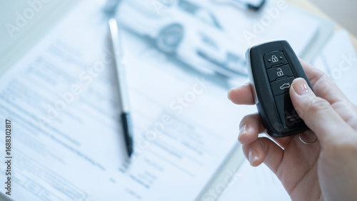 Vehicle remote keys with documents on the desk representing contract signing automobile sales deal and professional business process