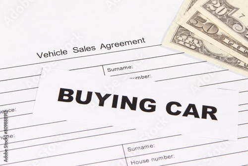 Vehicle sales agreement, inscription buying car and dollar banknotes. Sales, buying new or used car