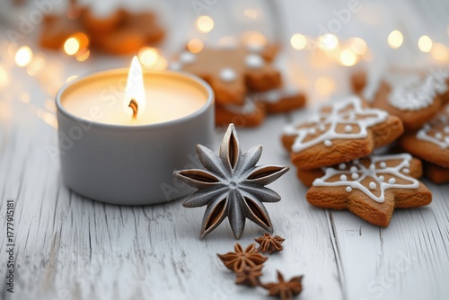 Vela acesa em recipiente cinza ao lado de biscoitos natalinos de gengibre e anis estrelado sobre mesa branca com luzes desfocadas ao fundo, IA generativa
