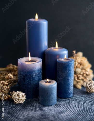 Velas encendidas de diferentes tamaños de color azul, decorativas