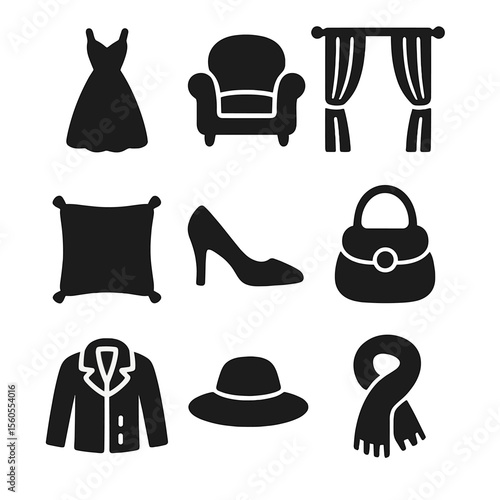 Velvet Icon Set. Solid, filled icon set of velvet fabric uses: evening gown, upholstery, curtains, cushions, shoes, handbags,