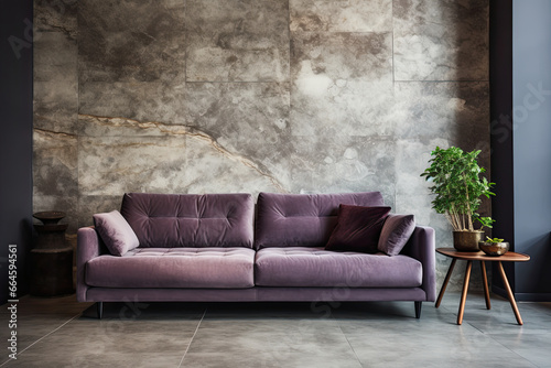 Velvet sofa against stone paneling wall. Interior design of modern living room.